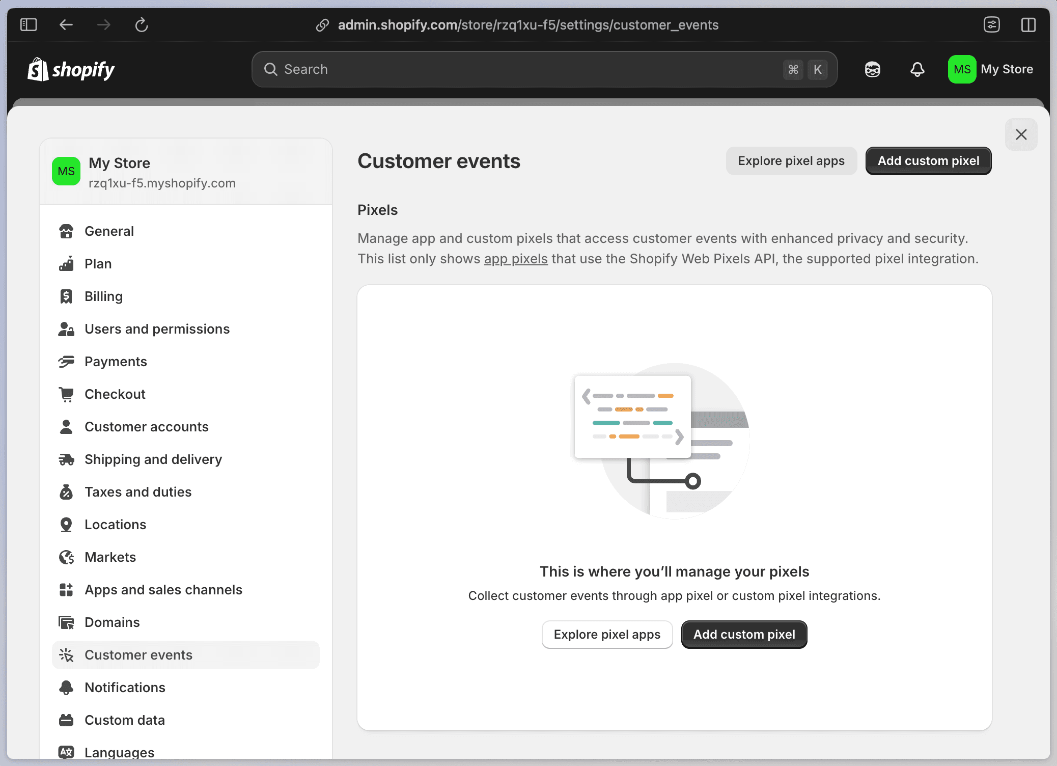 Go to your Shopify Store > Settings > Customer Events, click “Add custom Pixel”, and name your Pixel something snazzy